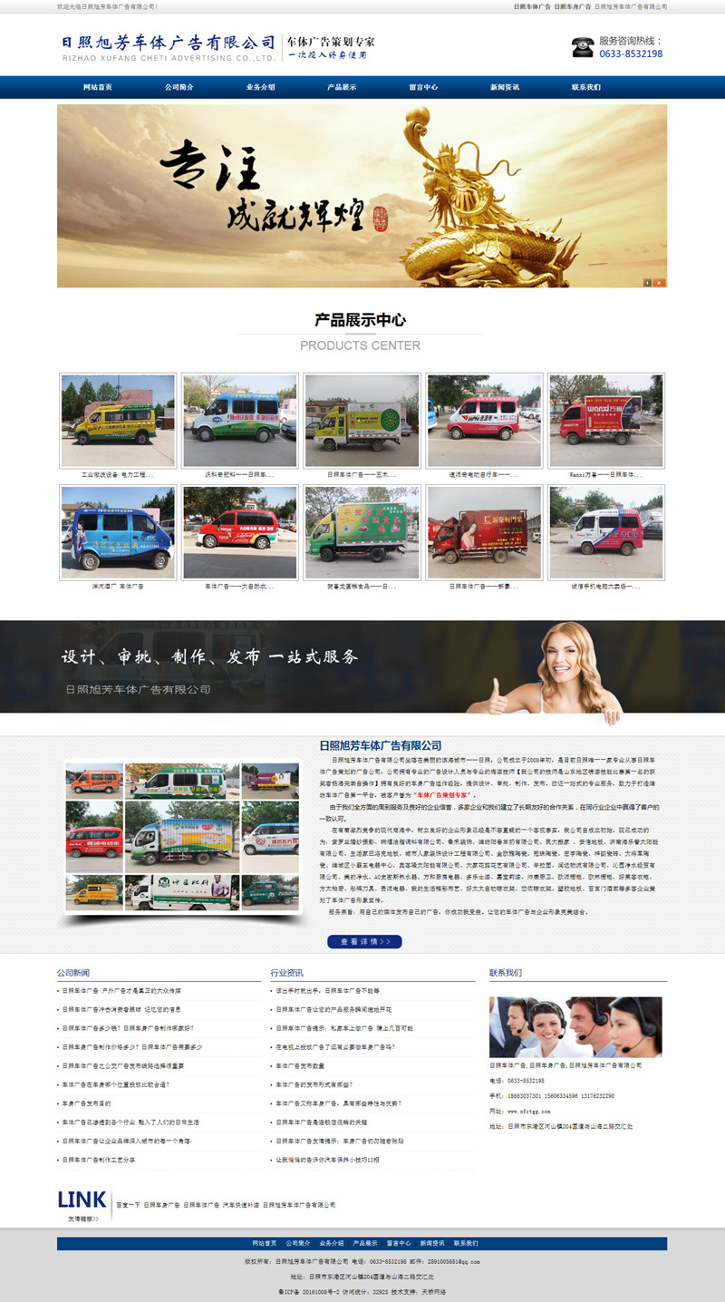 日照旭芳車體廣告有限公司坐落在美麗的濱海城市——日照,公司成立于2008年初,是目前日照唯一一家專業(yè)從事日照車體廣告策劃的廣告公司,公司擁有專業(yè)的廣告設(shè)計(jì)人員與專業(yè)的烤漆技師【我公司的技師是山東地區(qū)噴漆技能比賽第一名的獲獎(jiǎng)?wù)邨詈A劣H自操作】擁有良好的車身廣告運(yùn)作經(jīng)驗(yàn),提供設(shè)計(jì)、審批、制作、發(fā)布,改證一站式的專業(yè)服務(wù),致力于打造濰坊車體廣告第一平臺(tái),被客戶譽(yù)為“車體廣告策劃專家”。